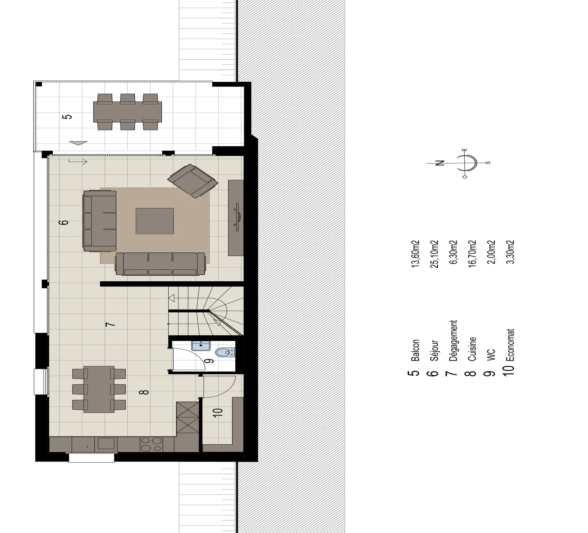 Au niveau intermédiaire, vous serez immédiatement séduit par la baie vitrée qui offre une vue imprenable sur le Chablais. La cuisine en “L“ et la salle à manger, situées sur le côté Ouest, bénéficient de deux fenêtres qui illuminent l'espace. Le salon, orienté à l'Est, s'étend harmonieusement sur environ 48 m² et s'ouvre sur un grand balcon couvert de 13,60 m². La généreuse surface vitrée sur près de la moitié de cet étage renforce l'effet panoramique, créant une atmosphère lumineuse et agréable.